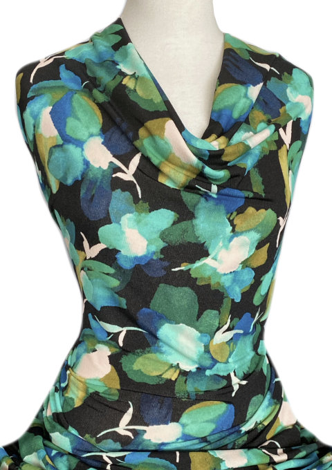 Knitwit Winter Printed Knit Tessa Turquoise Green on Black is a medium weight knit with a cosy textured feel. It is suitable for trans-seasonal and winter tops, soft skirts and dresses. It is also easy-care, doesn’t need ironing, and is great for travelling.